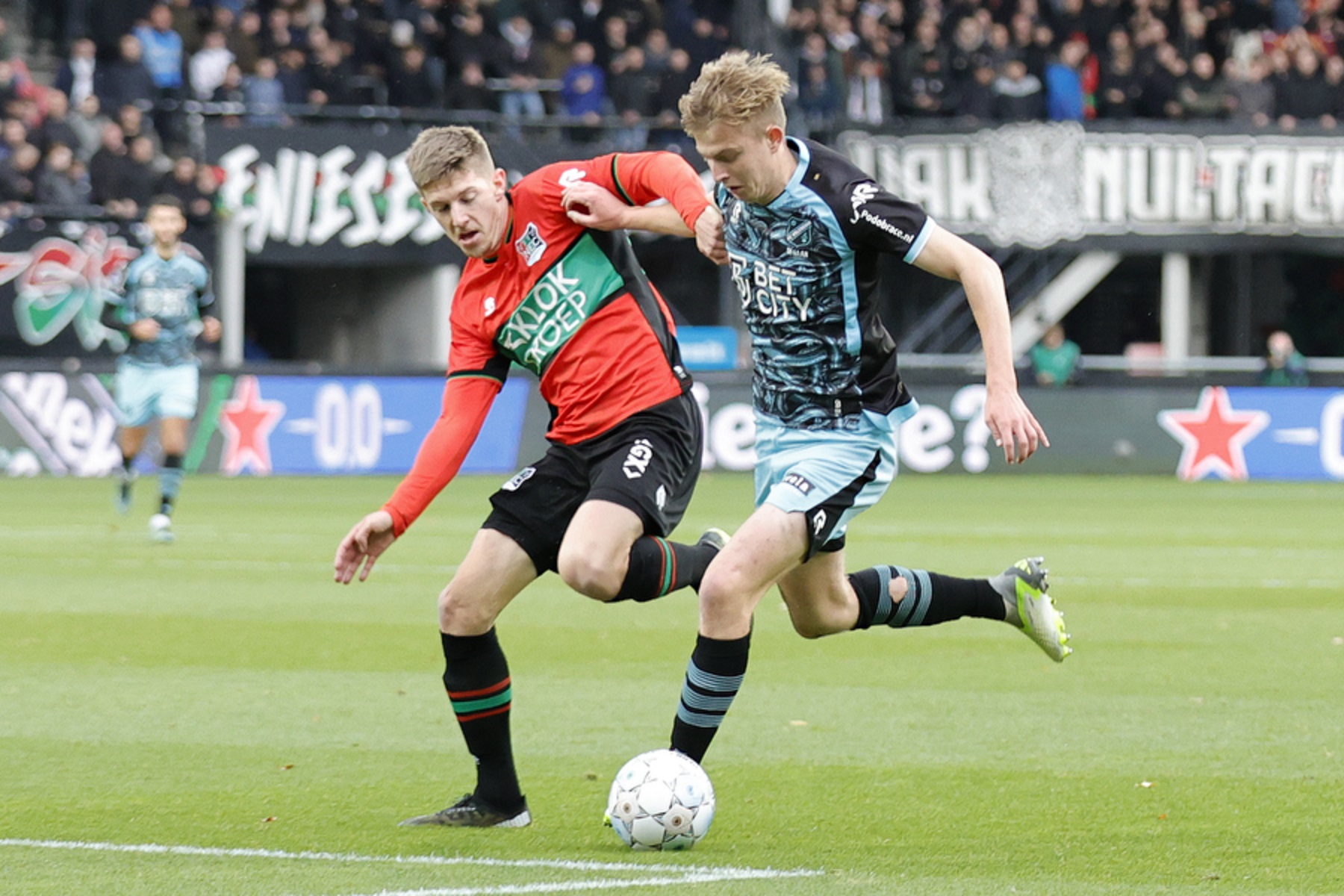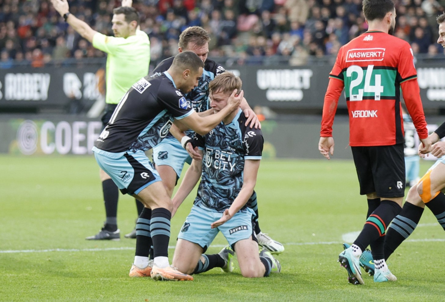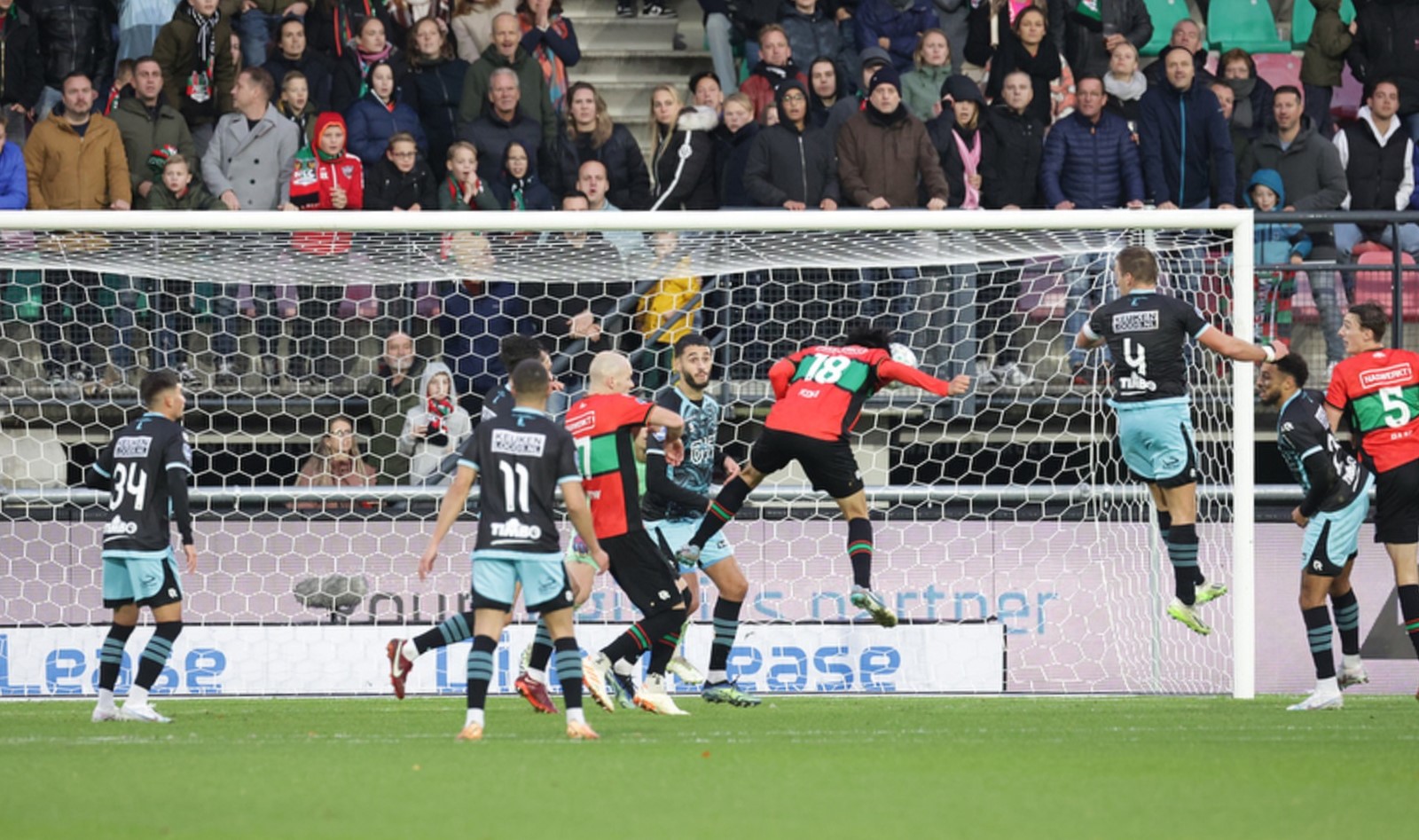 | Bijzonderheden | Al in de 6e minuut gaf FC Volendam aan NEC Nijmegen een cadeautje want Volendam-keeper Mio Backhaus schoof de bal in de opbouw kinderlijk in de voeten van een NEC-speler. Koki Ogawa had vervolgens geen moeite zijn landgenoot te passeren. De Japanse spits schoot na twintig minuten ook raak voor 2-0, maar die treffer werd door ingrijpen van de VAR wegens buitenspel afgekeurd. Daarmee bleef FC Volendam, dat het betere van het spel had, een tweede domper bespaard. FC Volendam kreeg een kleine 10 minuten voor rust de beloning voor het goede spel. Na een fraaie aanval via Calvin Twigt en George Cox kopte Robert Mühren in twee instanties raak. NEC Nijmegen moest bovendien nog voor rust met tien man verder. Elayis Tavsan vergreep zich in de 38e minuut voor de tweede keer aan Brian Cox en mocht met twee gele kaarten op zak inrukken van arbiter Jochem Kamphuis. Het numerieke overwicht leverde FC Volendam na rust wel balbezit op, maar veel kansen wist het niet te creëren tegen het massaal verdedigende NEC Nijmegen. Al was Milan de Haan met een pegel op de lat nog wel dicht bij een treffer. De spaarzame counters van NEC waren niet van gevaar ontbloot. Maar Benaissa Benamar assisteerde zijn doelman bij een inzet van opnieuw Koki Ogawa. Tien minuten voor tijd wist FC Volendam het Nijmeegse bolwerk dan toch te kraken. Achraf Douiri werd na een actie in de zestien meter aangetikt. Maar voor Kamphuis naar de strafschopstip had kunnen wijzen pegelde Milan de Haan de bal via de paal achter de kansloze Cillessen. In de slotfase ging het echter toch nog mis. Een misverstand tussen Damon Mirani en doelman Backhaus leidde de gelijkmaker in, waarbij laatstgenoemde de doorgebroken Sontje Hansen onderuit gleed. Magnus Mattsson had geen moeite met de strafschop, die door Jochem Kamphuis werd toegekend: 2-2. De arbiter was al de gebeten hond bij het Nijmeegse publiek. Dat werd alleen maar erger toen hij FC Volendam een vrije trap gaf voor een overtreding op Josh Flint. Calvin Twigt krulde fraai raak. Maar FC Volendam gaf in de knotsgekke slotfase de winst voor de tweede keer weg. Compleet vrijstaand kopte Koki Ogawa raak voor 3-3 uit een corner. |