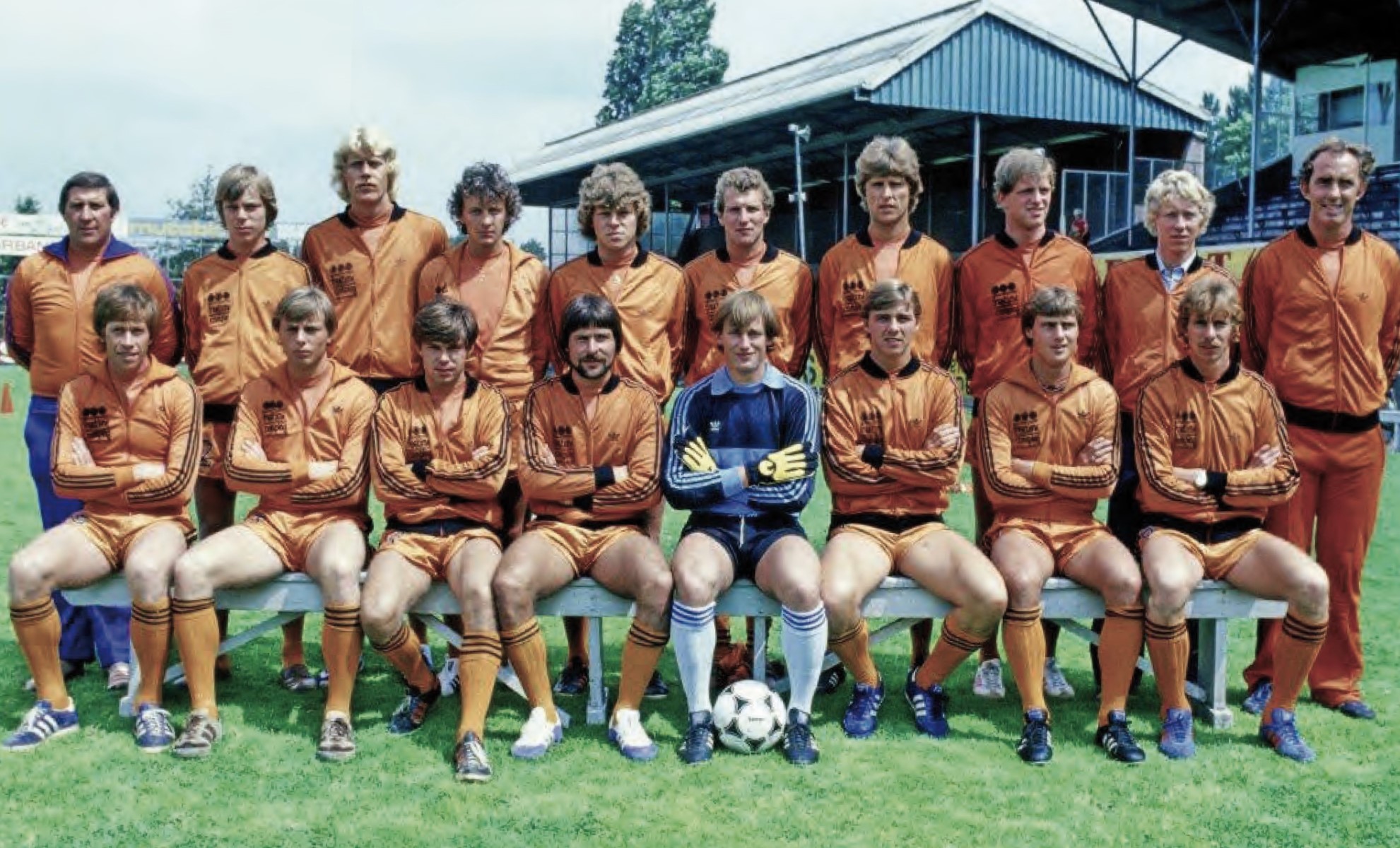 Boven vlnr. Henk Ellens (trainer), Jan Schokker, Kees Guijt, Kees Molenaar (Prop), Klaas Kwakman (Ket), Jaap Braan, Dick de Boer, Eddy Kraal, Leo Tholens (fysiotherapeut), Fred André. Beneden vlnr. Gerrie Muhren, Thoom Veerman (Vivo), Klaas Tuijp (Puk), Jaap Jonk (Suikere), Frans Hoek, Kees Molenaar (Keje), René Tol en Dick Helling.