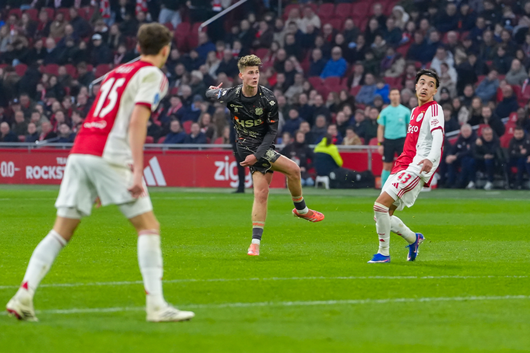| Bijzonderheden | Youri Baas in aanvallend opzicht goud waard voor de Amsterdammers. In de dertiende minuut kopte de verdediger een hoekschop van Rayane Bounida achter doelman Kayne van Oevelen. Ruim twintig minuten later betaalde de link tussen de twee Ajacieden zich opnieuw uit. Nu niet direct uit een corner, maar uit de naweeën daarvan. Opnieuw was Bounida de aangever en Baas het eindstation: 2-0. FC Volendam had op dat moment ook enige mogelijkheden gecreëerd. De grootste was voor Joel Ideho. De vleugelaanvaller stuurde, kort na de 1-0, Youri Regeer het bos is, waarna Vitezslav Jaros redding bracht op Ideho’s inzet. Maar de beste kansen waren voor Ajax, maar die ploeg zag zich regelmatig gestuit door doelman Kayne van Oevelen. Dave Kwakman was in de eerste helft het dichtst bij een doelpunt voor de bezoekers. Kort voor de rust dreunde hij de bal op de paal. In de tweede helft kwam FC Volendam er in aanvallend opzicht nauwelijks aan te pas. Drie krachteloze pogingen, van Ozan Kökçü, Yannick Leliendal en Brandlet Kuwas, was de schamele - en weinig succesvolle - oogst. Achterin bleef de schade beperkt tot de twee treffers van Baas van voor rust, met dank aan doelman Kayne van Oevelen. | |||